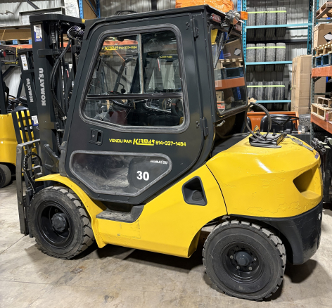 Chariot élévateur au propane, Komatsu, modèle FG30HT-16, capacité de 6,000 lbs, 4,207 heures. Équipé d’un mât à 3 sections, hauteur abaissée de 88’’ et hauteur de levée de 190’’ et pneus pneumatiques increvables. Chariot reconditionné et en excellente condition. Garantie de 90 jours. Fourches 42 po ou 48 po incluses.
